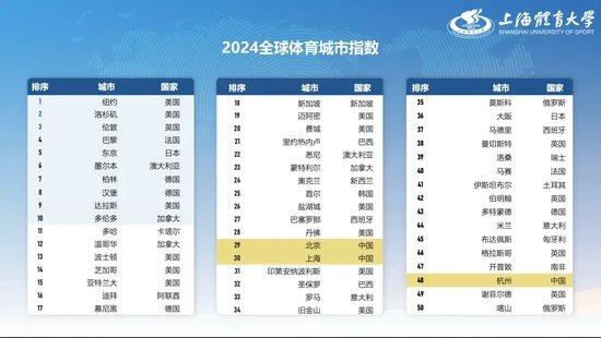 上海体育大学发布了《2024全球体育城市指数》,纽约、洛杉矶、伦敦、巴黎、东京位居全球体育城市概述排名前五;中国有三个城市置身全球50强。